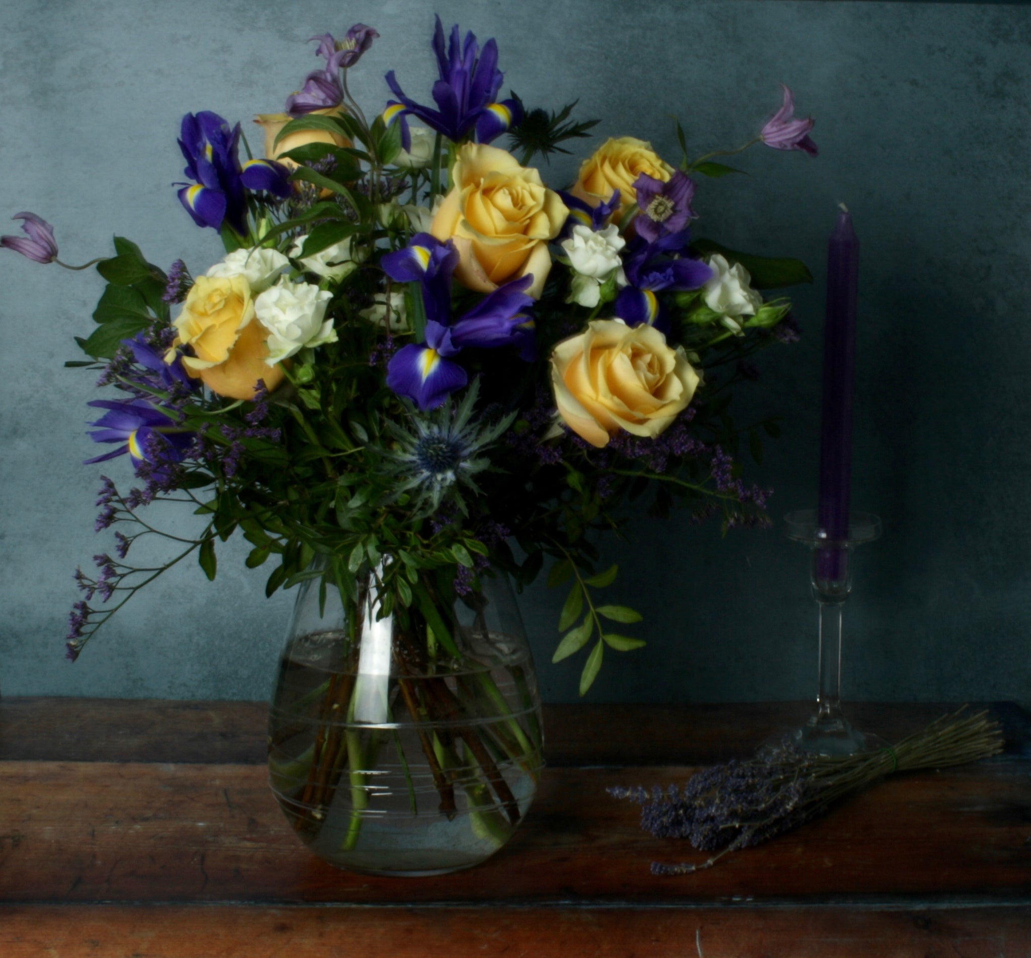 This bouquet is thoughtfully designed with iris, golden rose, wispy clematis and eryngium along with other blooms in violet hues and soft whites.