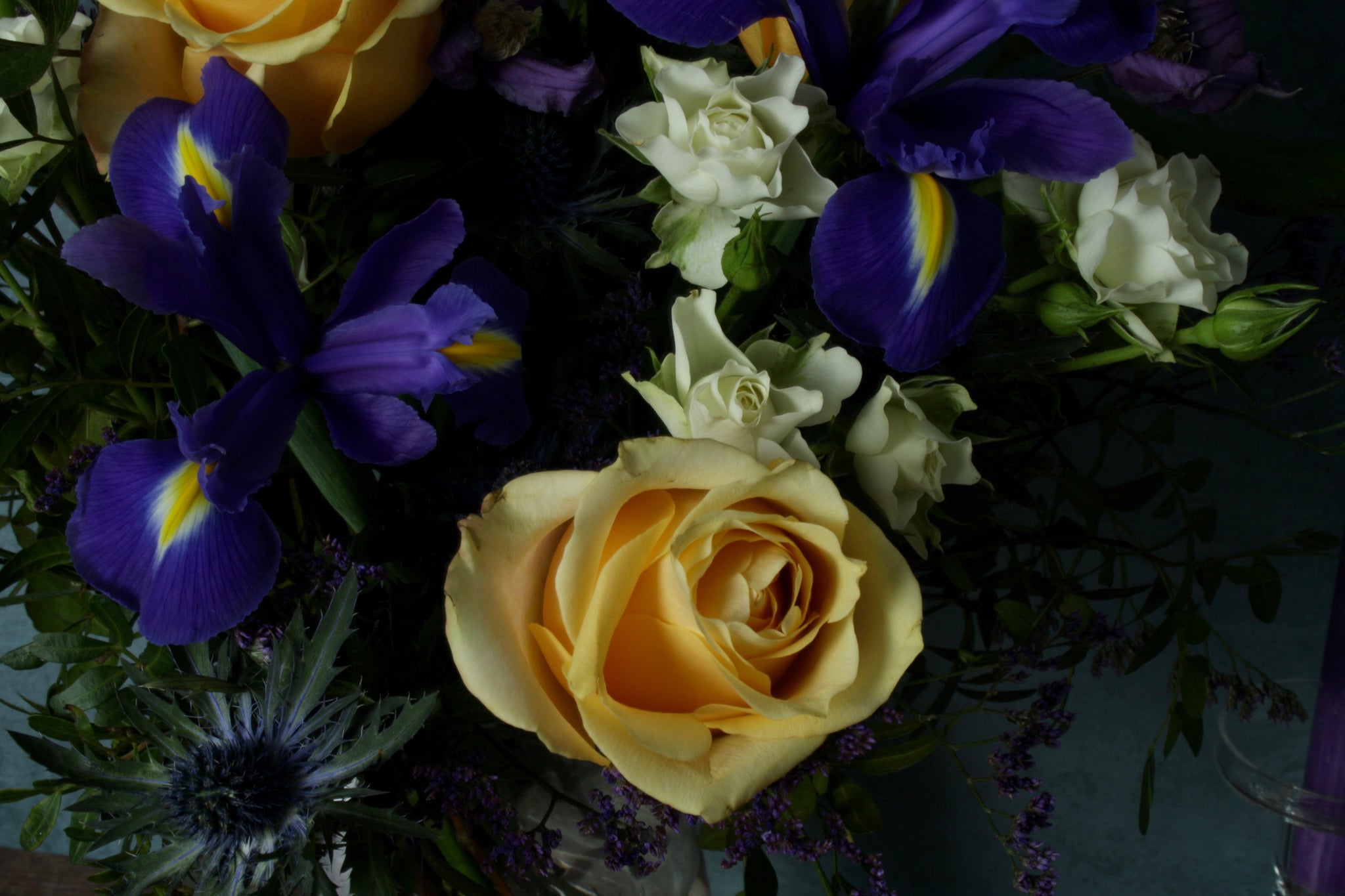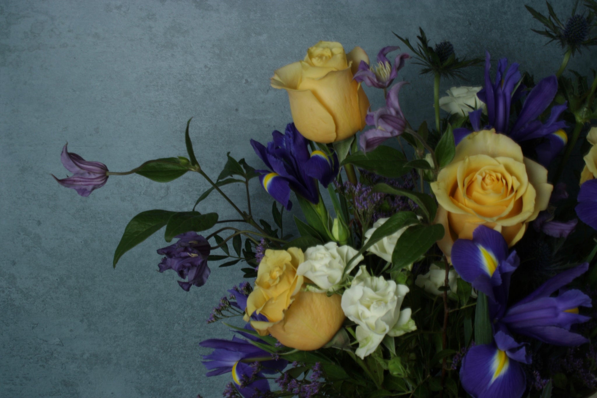 This bouquet is thoughtfully designed with iris, golden rose, wispy clematis and eryngium along with other blooms in violet hues and soft whites.
